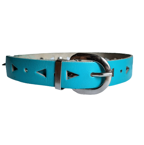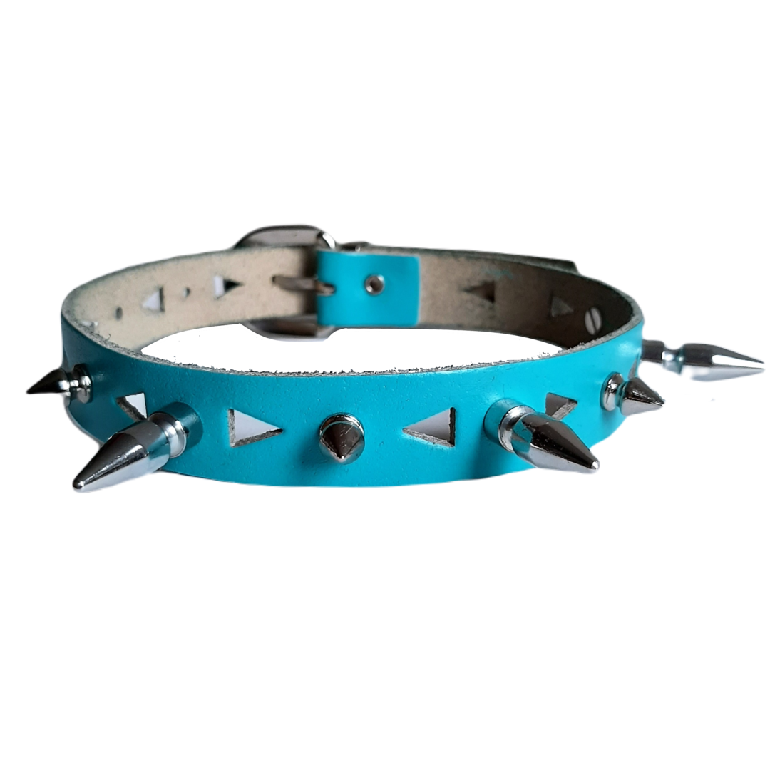De aqua leren ketting met spikes heeft een breedte van 2 cm en is geschikt voor een halsomtrek tussen 31 - 41,5 cm. De spikes afwisselend 2,5 en 1 cm hoog.