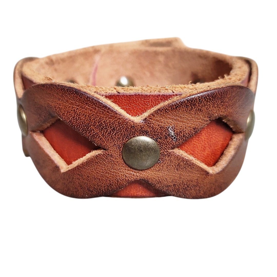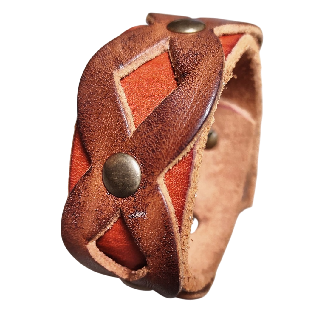Armband van gerecycled, bruin leer versierd met donkerbruin leren opengewerkte band die is vastgezet met bronskleurige studs.