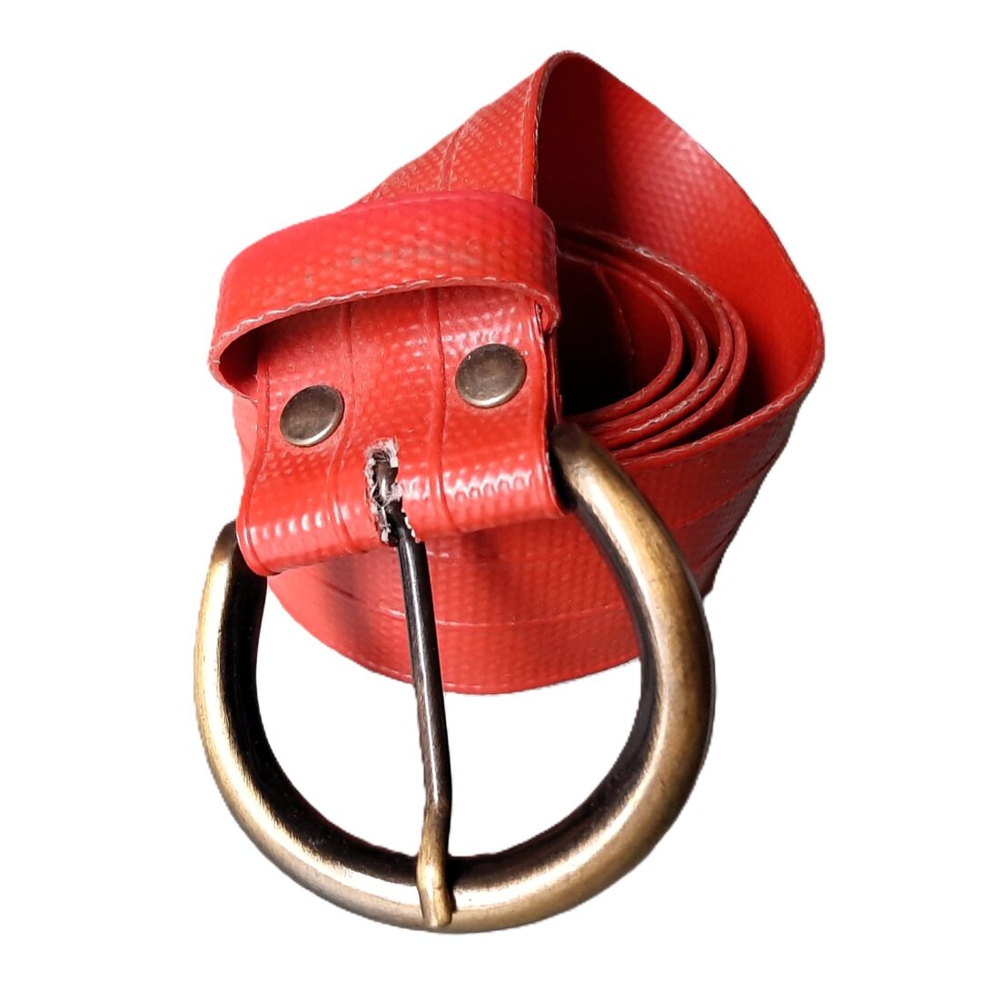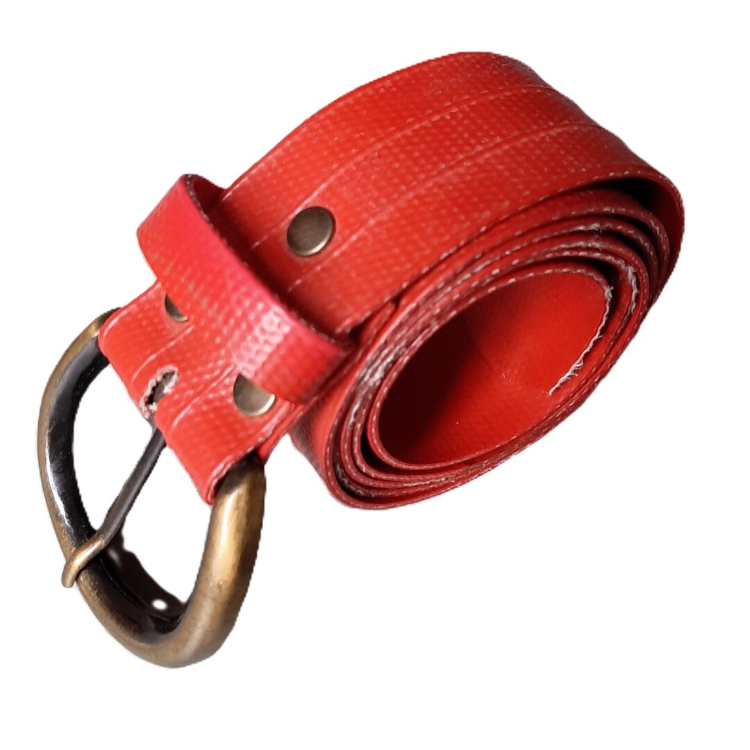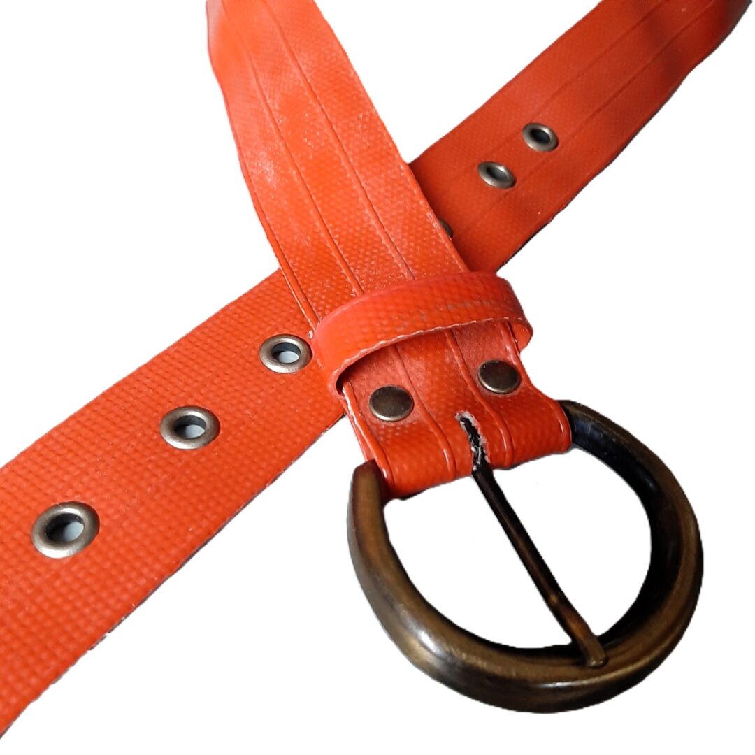 Stoere riem van 4 cm breed, gemaakt van hergebruikte brandweerslang. De riem is voorzien van een ronde, koperkleurige gesp. Geschikt voor heup/taille omtrek 87 – 105 cm. Van deze riem is één exemplaar beschikbaar.