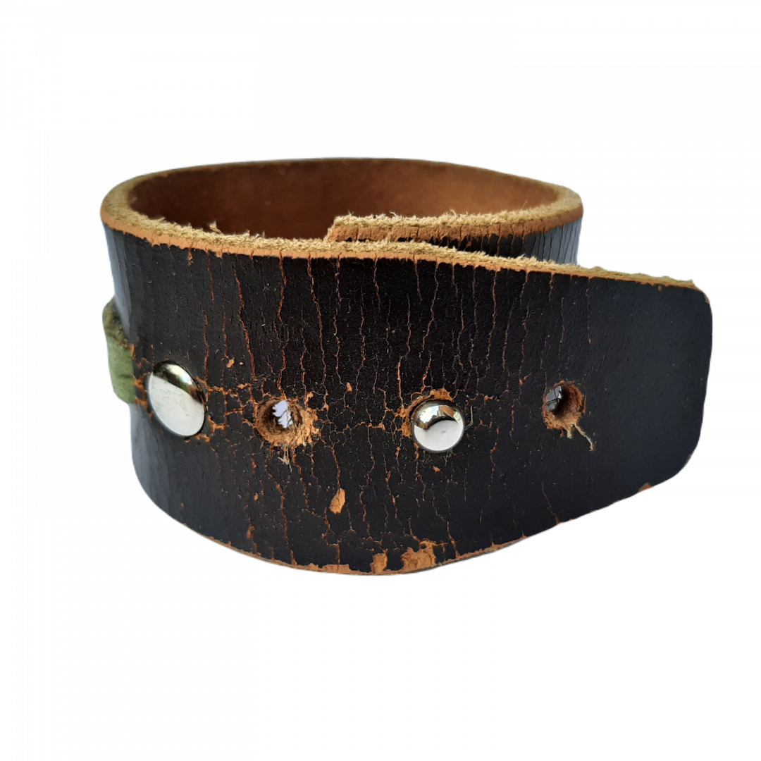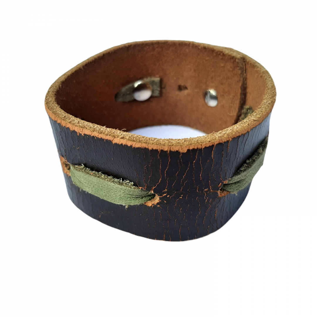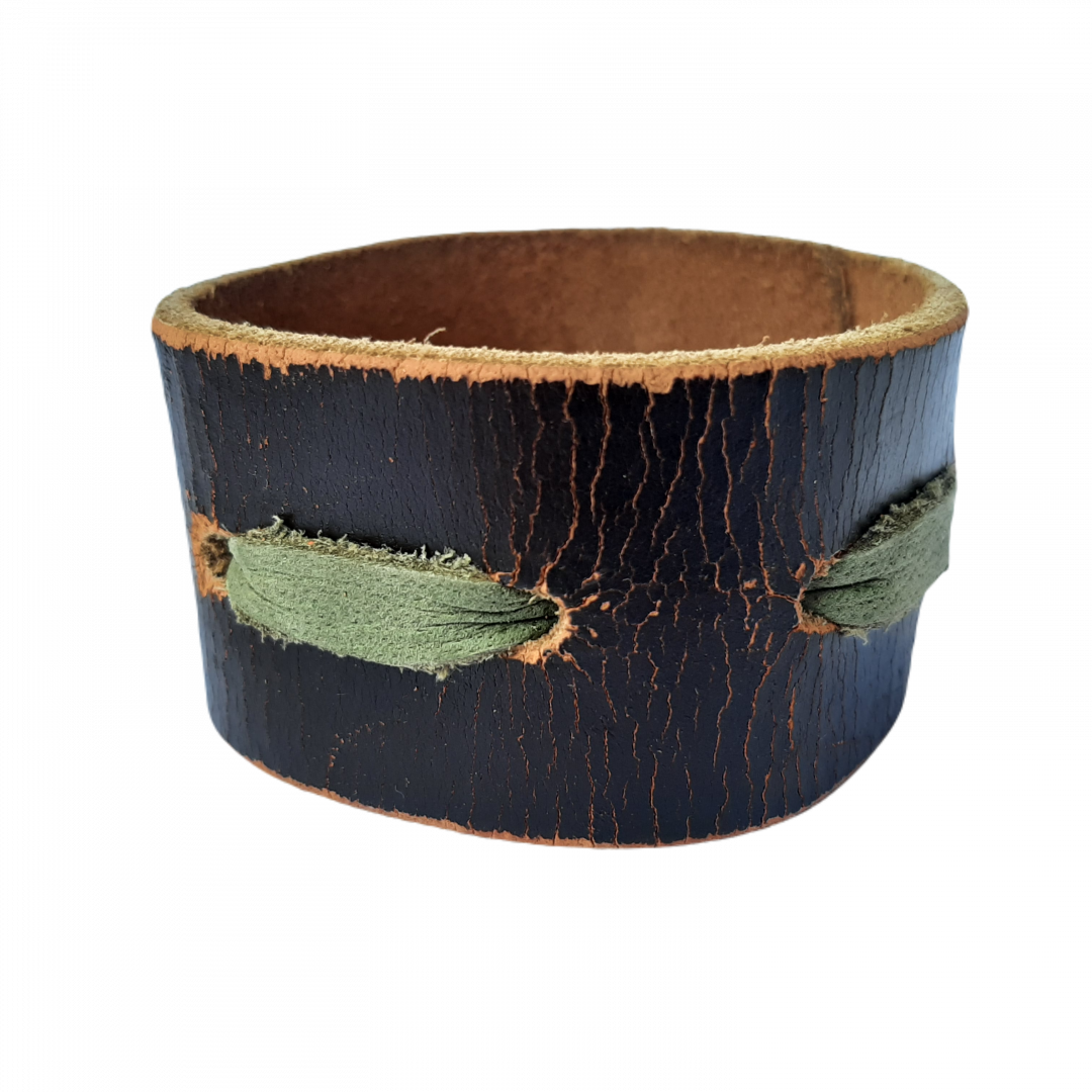 Armband van gerecycled, soepel, bruin leer versierd met groen leren ‘lint’ en vintage uitstraling. Maten: 3,5 cm breed, geschikt voor polsomvang 15 – 21 cm.