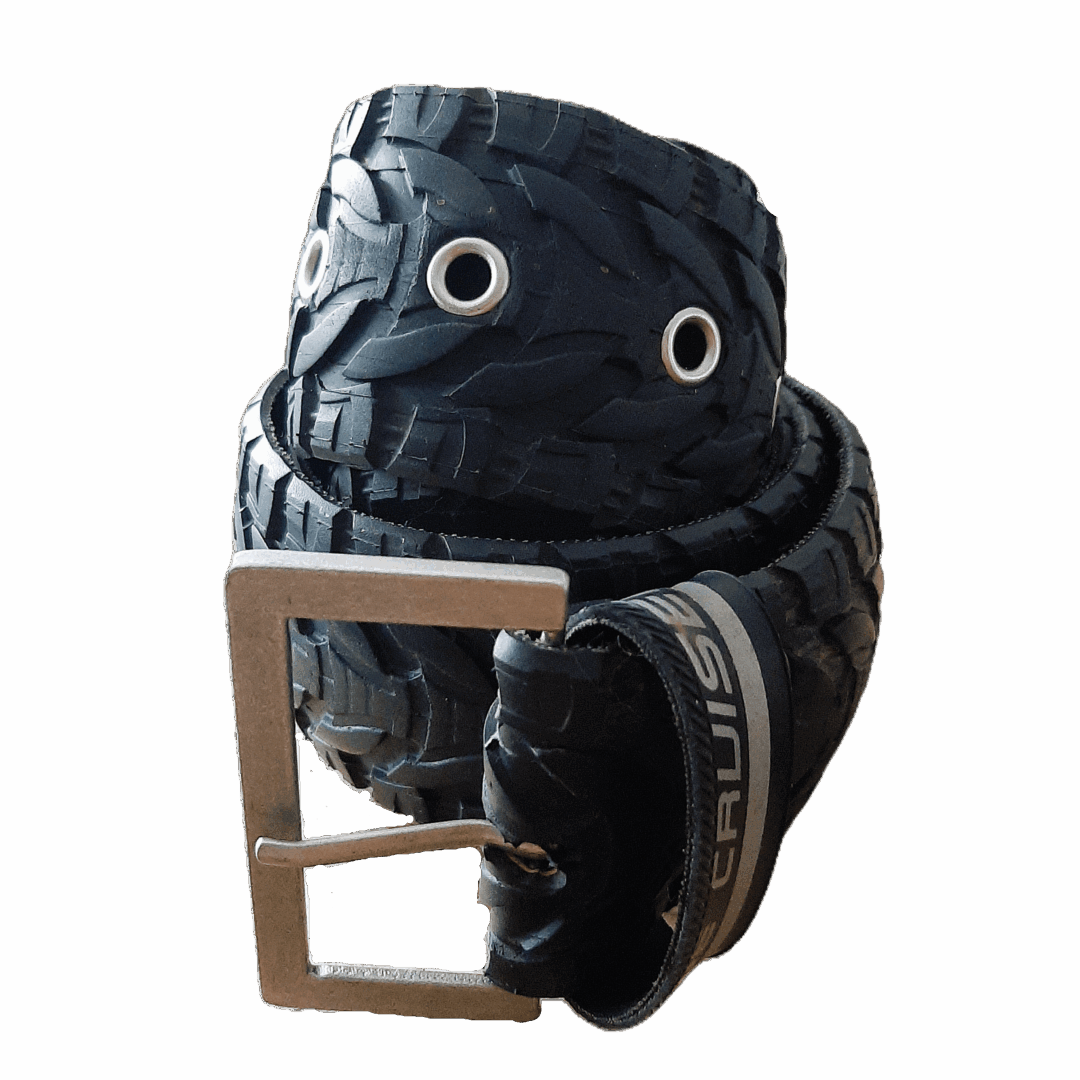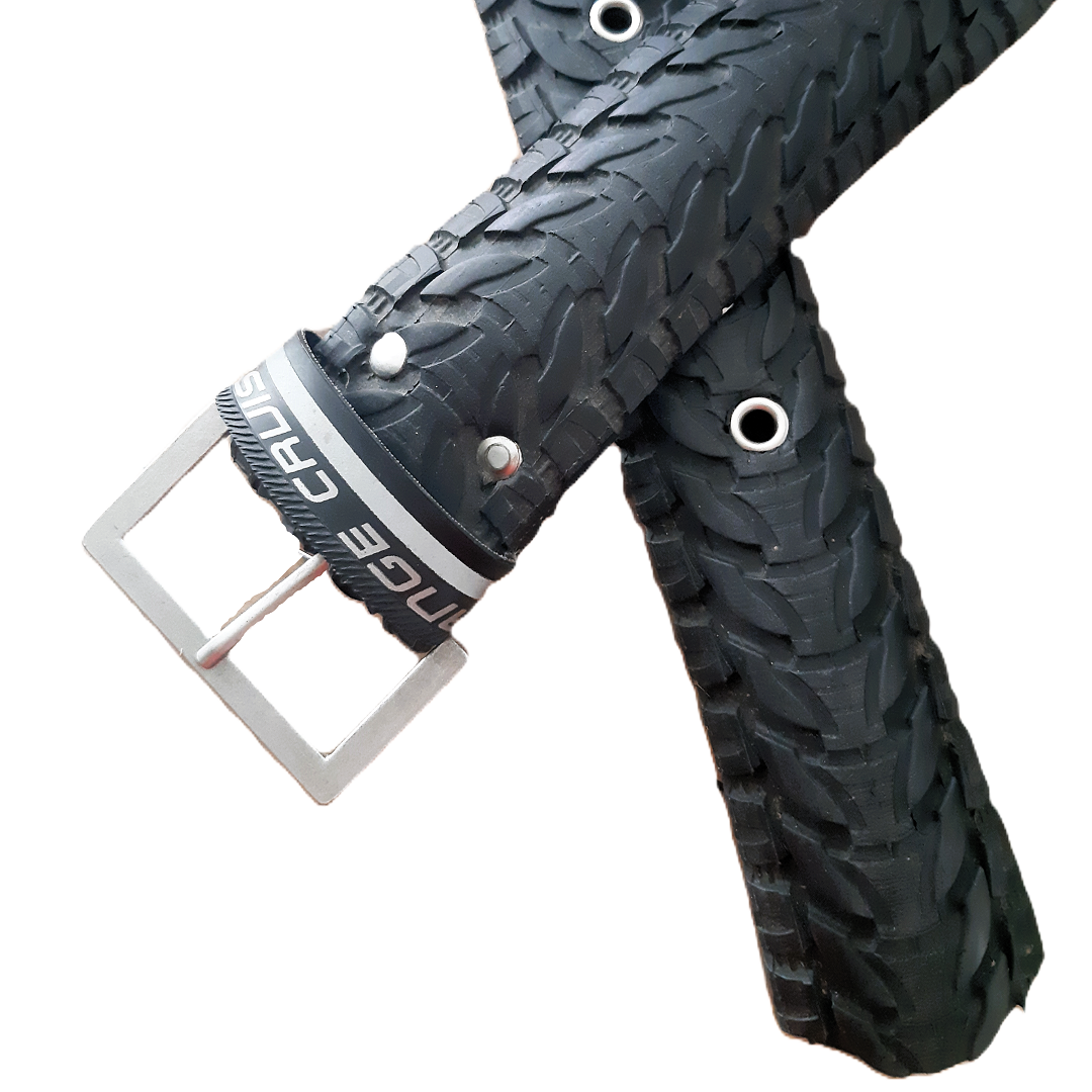 De buitenband van een fiets bestaat uit een karkas van koordlagen van langvezelige katoen, die het canvas vormen. Daaromheen is een rubberlaag aangebracht met op het loopvlak een profiel. Sommige banden hebben koordlagen van kunststofvezels. Deze fietsband kan nog wel een rondje mee. Daarom hebben we er een stoere riem van gemaakt!