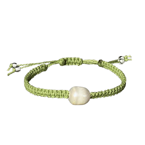 Subtiel geknoopt armbandje van groen waxkoord met een schitterende natuurlijke Parel. De Parel meet circa 1 x 1 cm. Het waxkoord is van nylon, dus kan wel tegen een stootje. Deze armband is uitermate geschikt voor mensen die smalle polsen hebben of liever subtiele armbandjes dragen. De sluiting is een zogenaamde schuif-sluiting. Geschikt voor mensen die liever geen leer dragen.