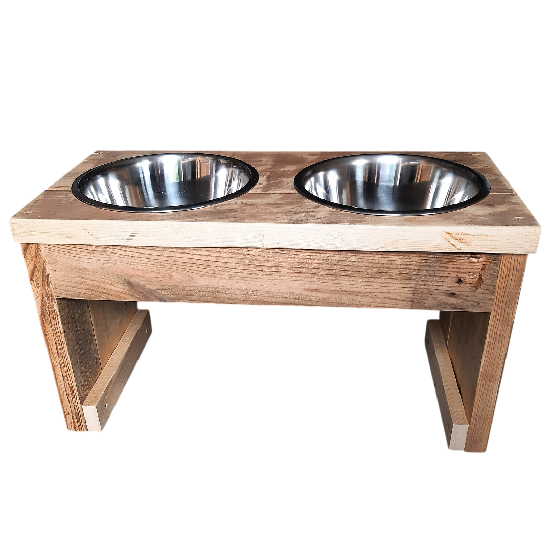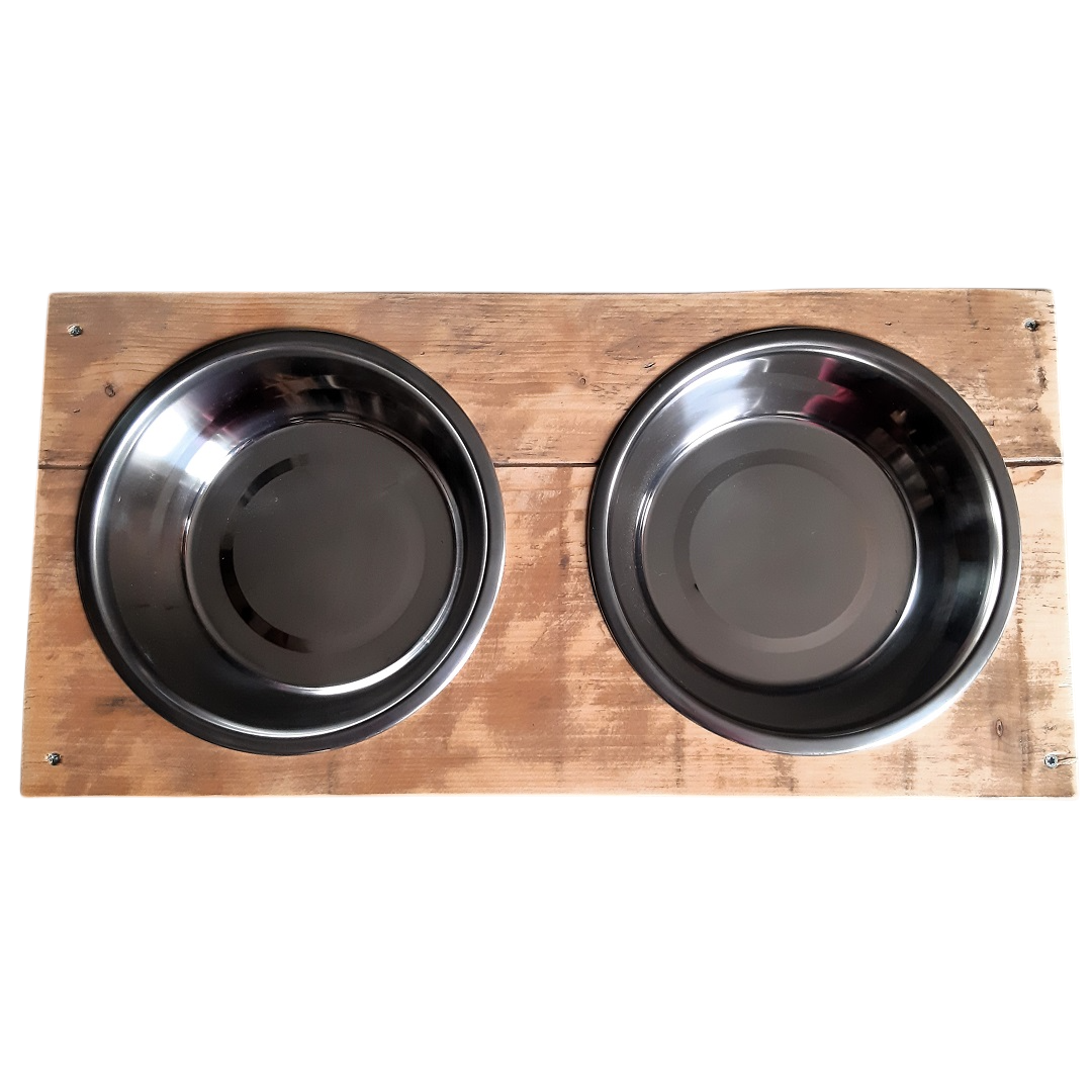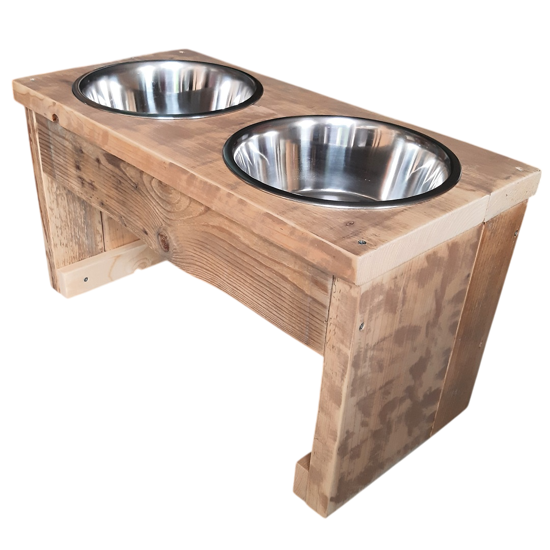 Hondenvoerbak voor een grote hond. Het voermeubel is gemaakt van hergebruikt hout, gladgeschuurd en afgewerkt met transparante lak (voor binnen gebruik).