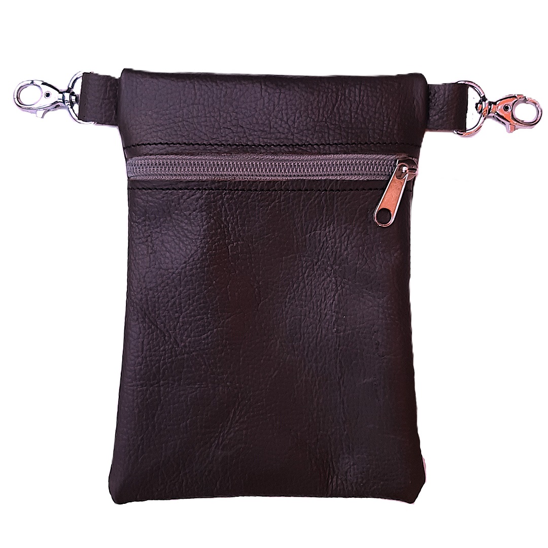 Heuptasje van donkerbruin hergebruikt leer, voorzien van grijze rits en zilverkleurige musketonhaken. Afmeting is circa 18,5 x 12,5 cm. Precies genoeg voor de belangrijkste spulletjes, voor op reis of naar een festival. Met de musketonhaken bevestig je het tasje aan de riemlussen van je broek.