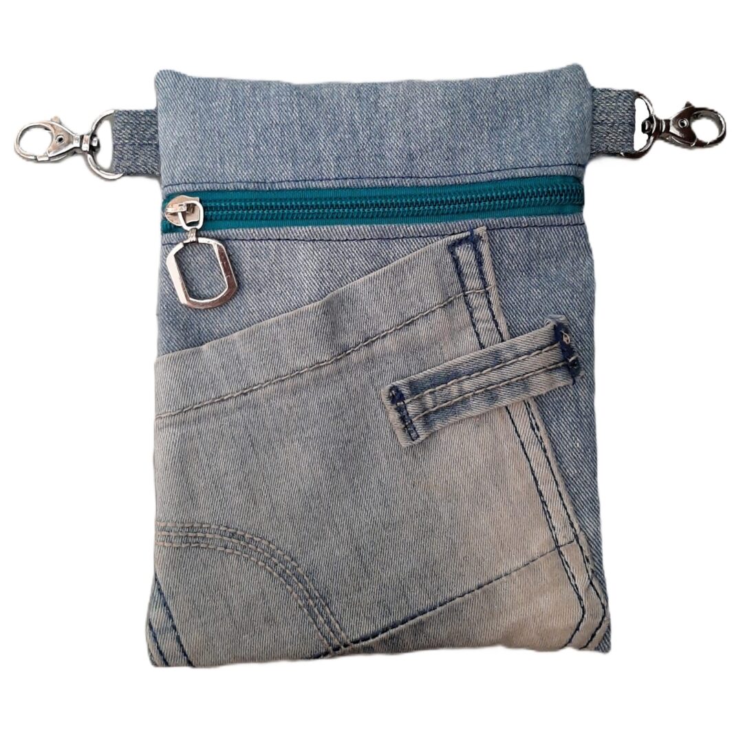 Heuptasje van van hergebruikte jeans (vegan), voorzien van petrol kleurige rits en grappige details. Afmeting is circa 18,5 x 14 cm. Precies genoeg voor de belangrijkste spulletjes, voor op reis of naar een festival. Met de musketonhaken bevestig je het tasje aan de riemlussen van je broek.