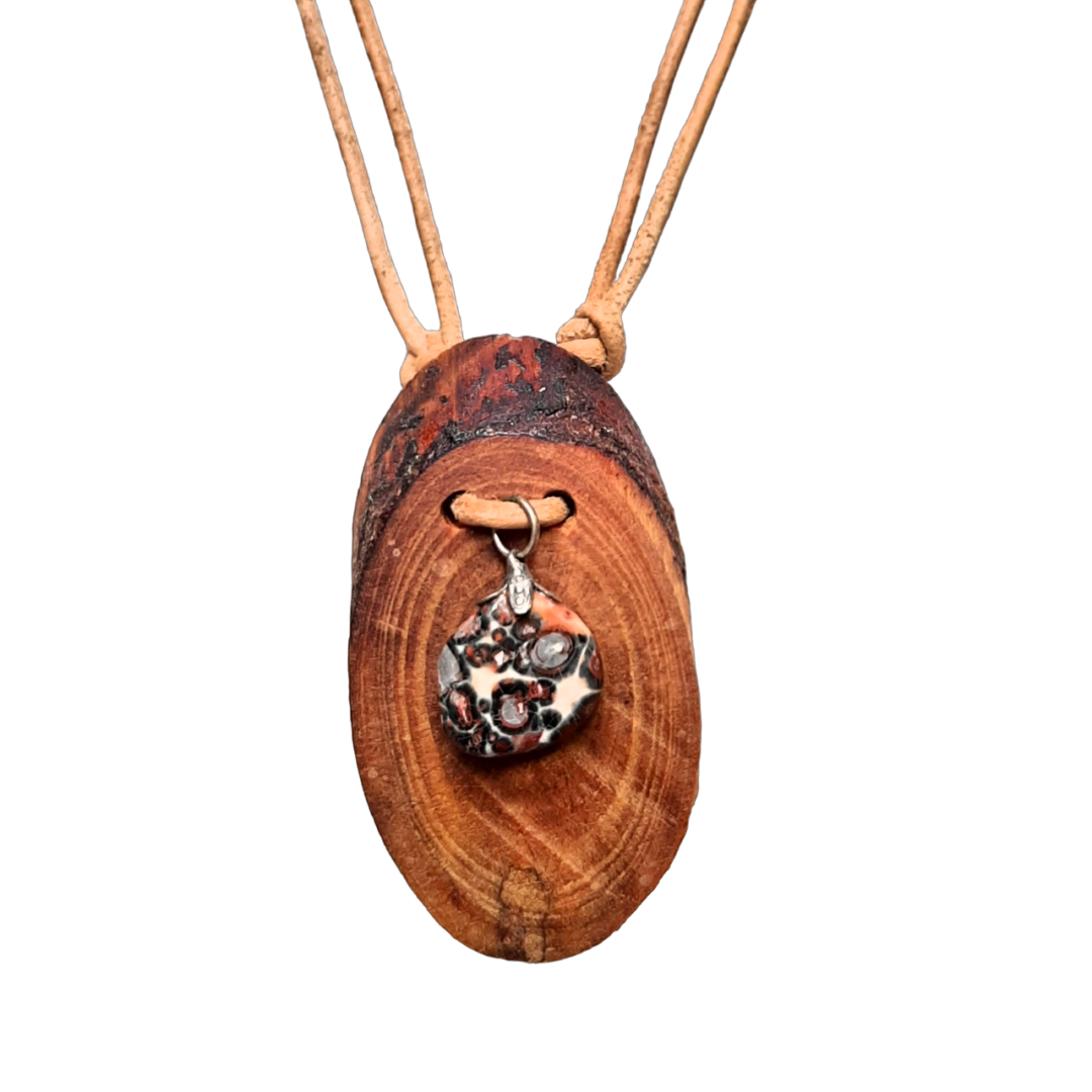 Naturel leren ketting met een hanger van Luipaard Jaspis op hout
