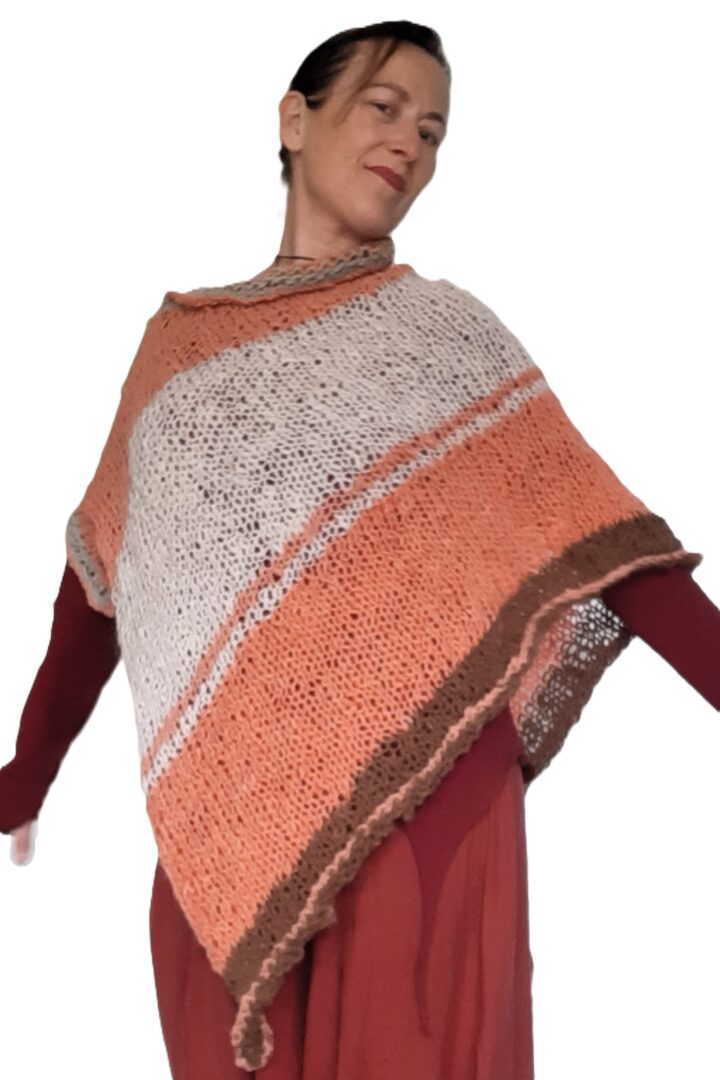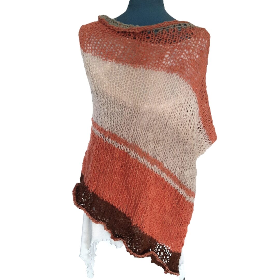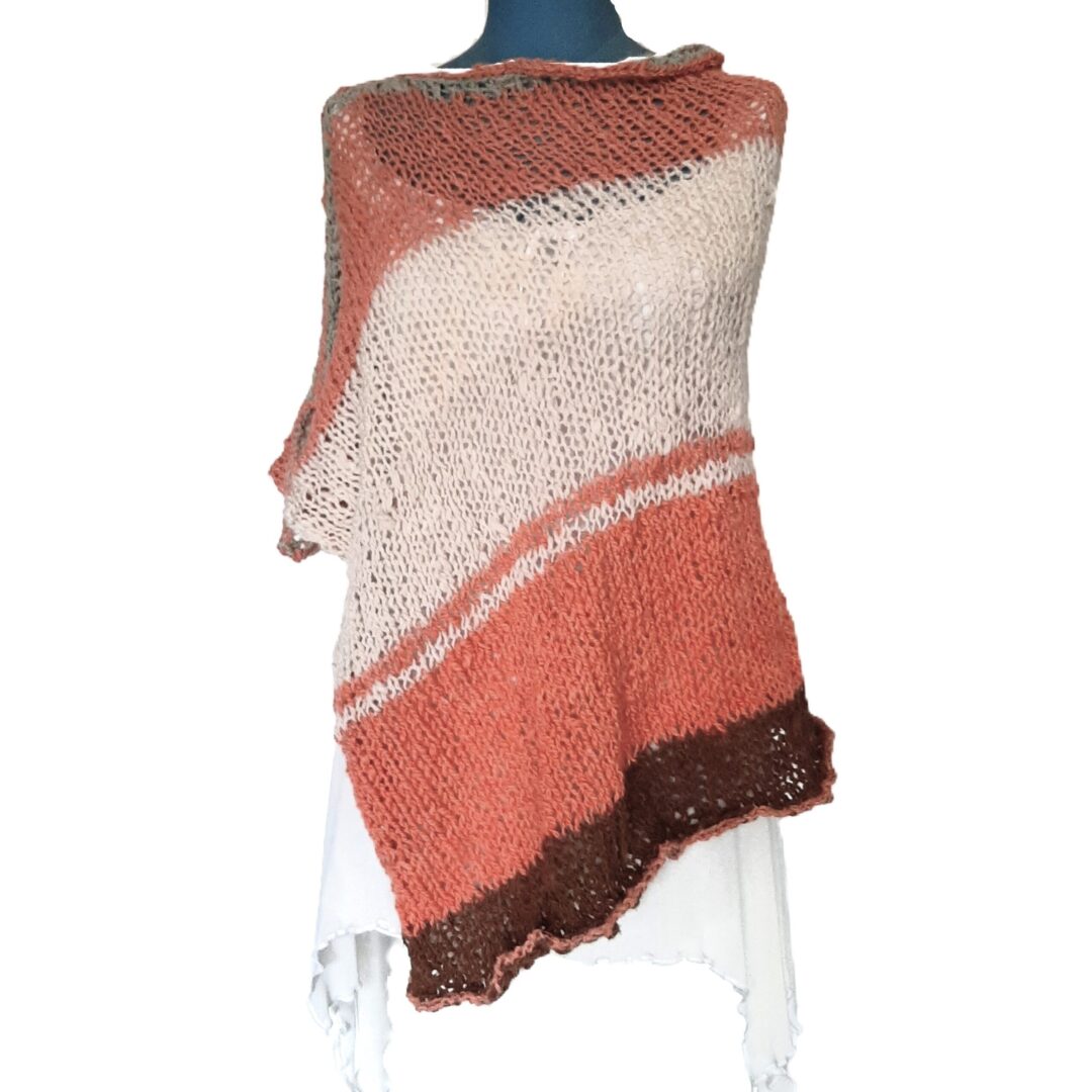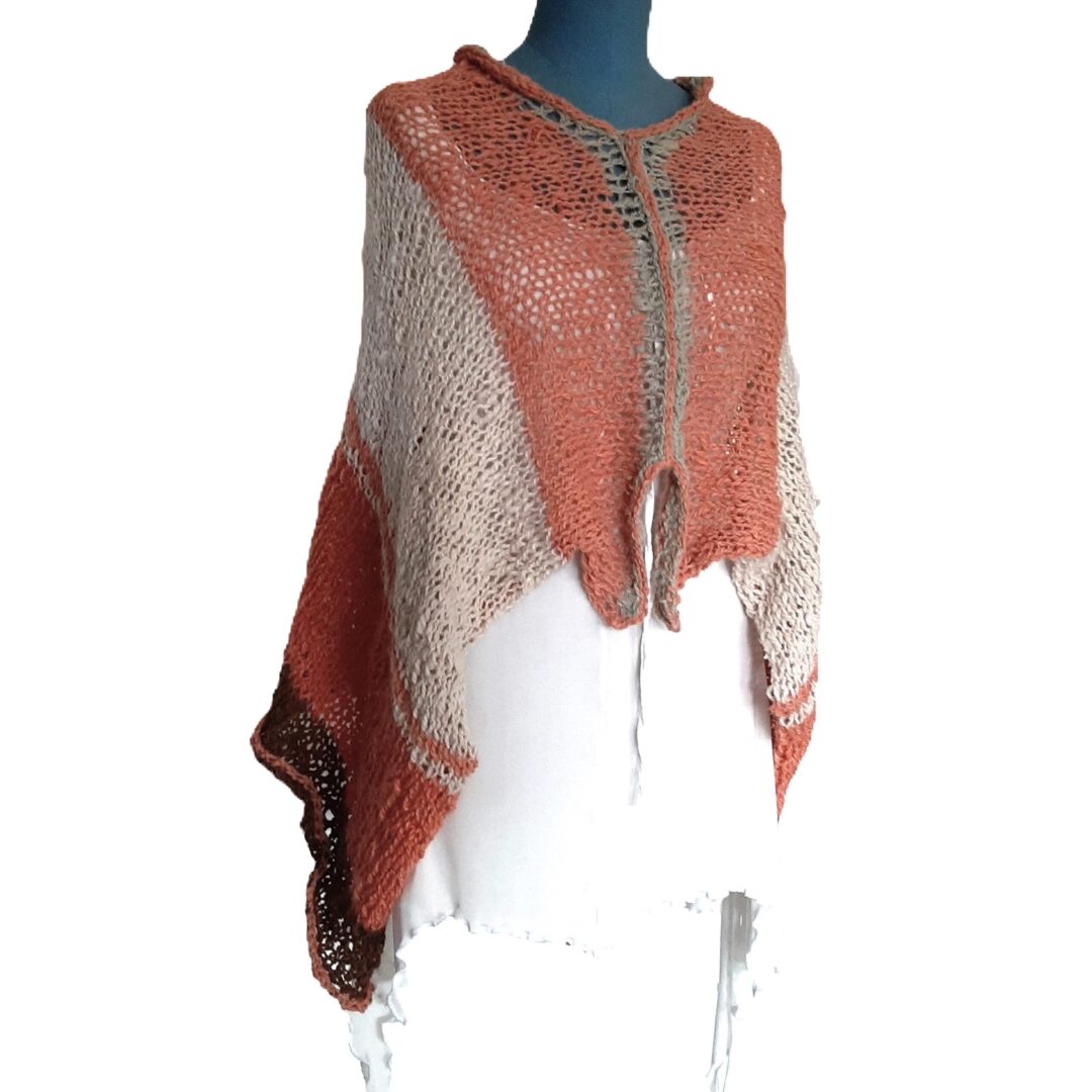 Zachte, warme poncho in frisse lentekleuren. De poncho is gemaakt van handgesponnen en handgebreide wol. Deze wol is een mix van alpaca, lamswol en mohair, gekleurd met natuurlijke verfstoffen. Een unieke creatie voor wie wol weet te waarderen.