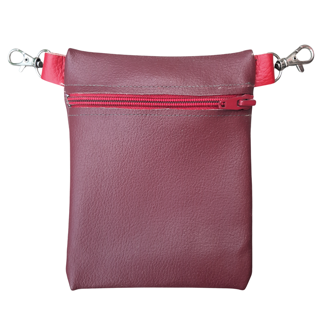 Heuptasje van rood hergebruikt leer, voorzien van rode rits en zilverkleurige musketonhaken. Afmeting is circa 16,5 x 13 cm. Precies genoeg voor de belangrijkste spulletjes, voor op reis of naar een festival. Met de musketonhaken bevestig je het tasje aan de riemlussen van je broek.