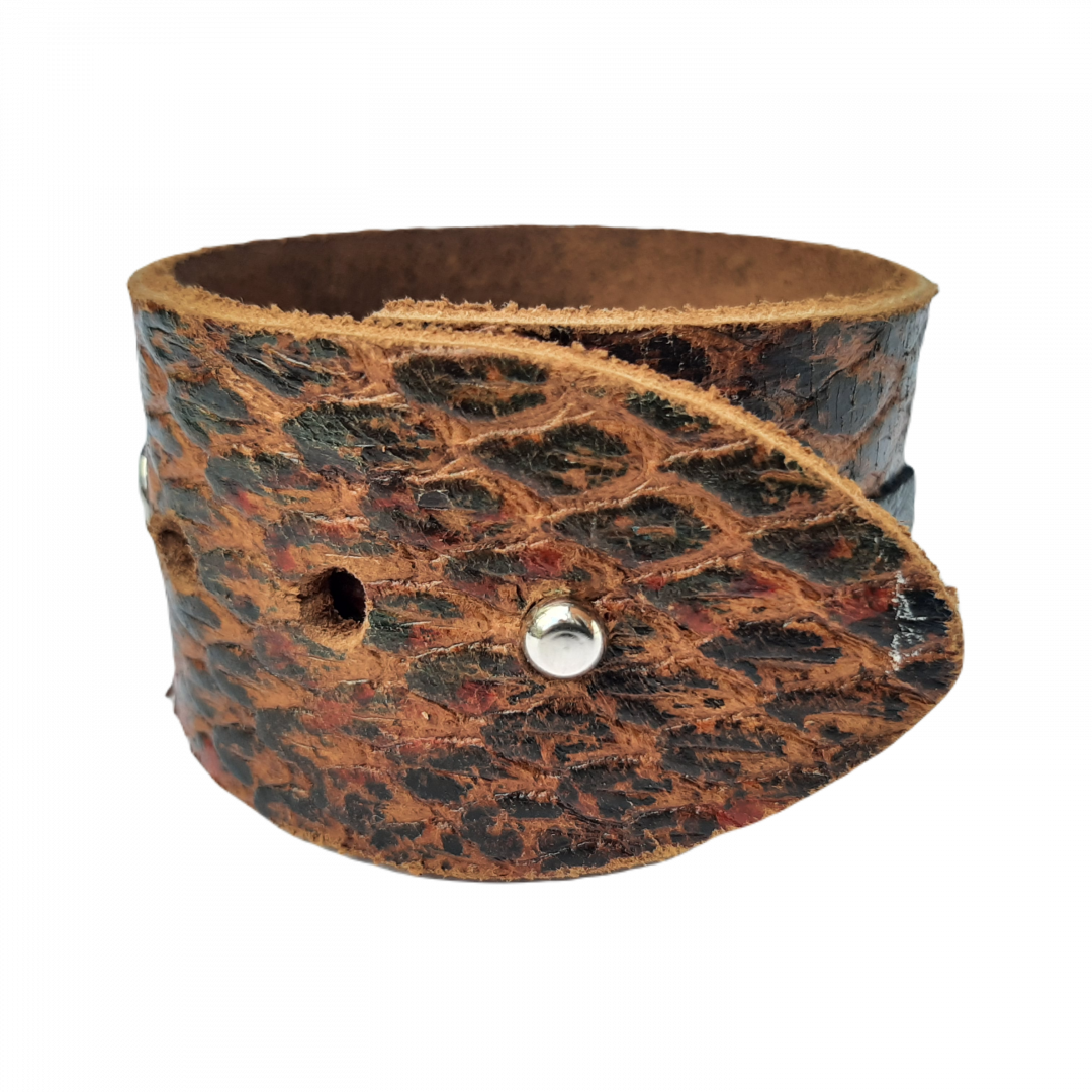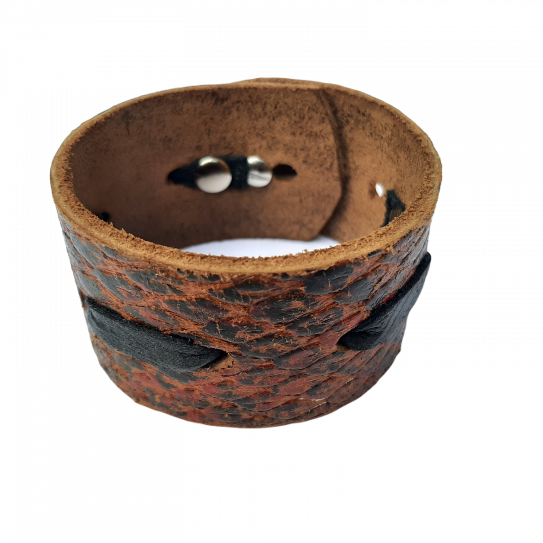 Armband van gerecycled, stevig, roodbruin leer versierd met zwart leren 'lint'. Door de slangenprint heeft de band een robuuste uitstraling. Deze sluit met een pinsluiting die je op verschillende maten kunt afstellen. Als je van stoer en robuust houdt, dan is dit wellicht de armband voor jou!