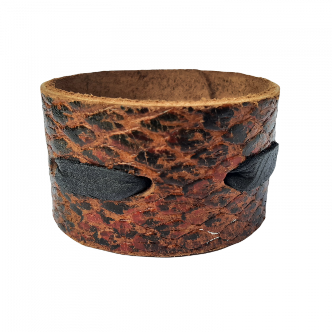 Armband van gerecycled, stevig, roodbruin leer met slangenprint, versierd met zwart leren ‘lint’. Maten: 4 cm breed, geschikt voor polsomvang 15,5 – 18,5 cm.