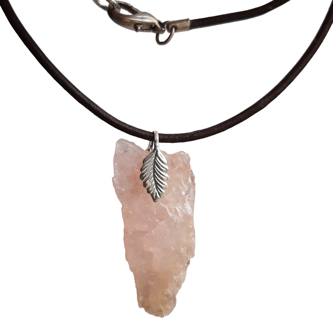 Bruin leerkoord met een Rozenkwarts hanger. Ook verkrijgbaar met andere soorten edelsteen.
