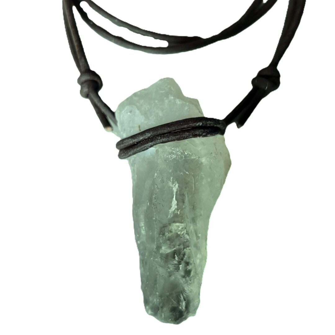 Donkerbruin leren ketting met een ruwe Chloriet. De ketting is afgewerkt met schuifknoop, zodat deze voor elke drager geschikt is. Desgewenst wordt de ketting geleverd met een verzilverd slotje (vermeld dit in de opmerkingen bij je bestelling). De totale lengte van de ketting is dan ca. 47cm. Verkrijgbaar met veel verschillende soorten edelsteen.