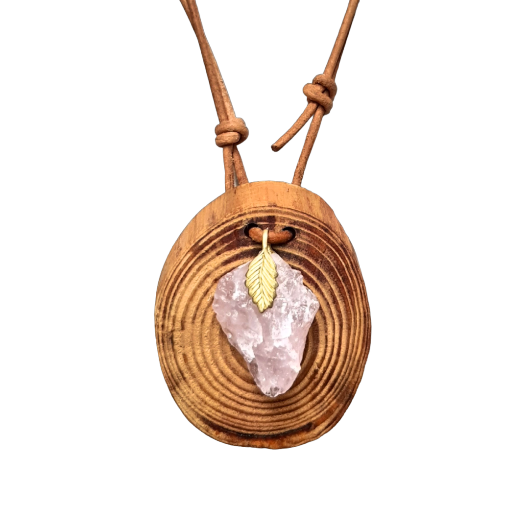 Ruwe rozenkwarts op hout aan naturel leerkoord. Ook verkrijgbaar met andere soorten edelsteen.