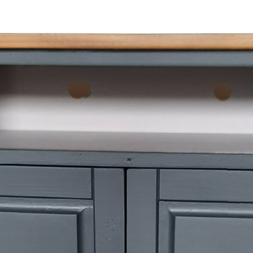 Unieke houten kast die ik heb hersteld en een complete metamorfose gegeven. De buitenzijde is mat grijs, de binnenkant mat taupe. De nerven van het houten bovenblad worden extra benadrukt en beschermd door twee lagen zijdeglans transparante lak.
