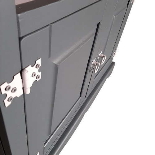 In de achterkant van het bovenste vak zitten twee gaten waar snoeren doorheen kunnen. De deurtjes sluiten met een magneet. Hierachter bevindt zich nog een plank.