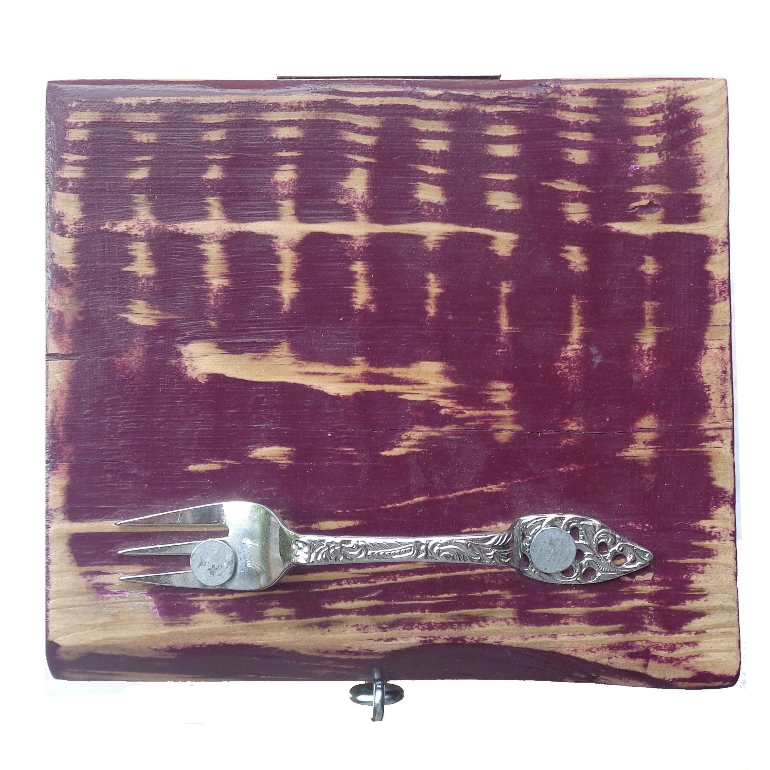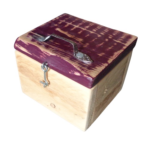 Rustiek houten kistje van gerecyclede materialen, met een vintage look. Het hout komt van pallets. Het kistje is afgewerkt met een paars deksel met verweerde uitstraling en een handvat gemaakt van een vorkje.