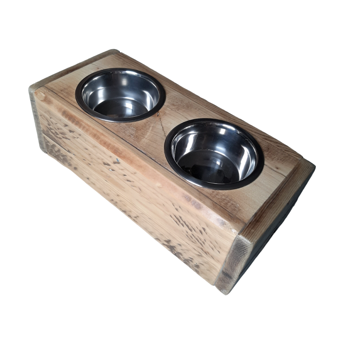 Katten voermeubel met 2 bakjes, gemaakt van hergebruikt hout. Gladgeschuurd en blank afgelakt.