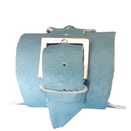 Stoere wikkelarmband van gerecycled lichtblauw leer, versierd met mooie kwaliteit geslepen donut van Fancy Jaspis. De band is ca. 8 cm breed, geschikt voor vrijwel elke polsomvang en voorzien van gesp. De armband dient strak om de pols te worden gewikkeld en vastgemaakt om mooi te blijven zitten.
