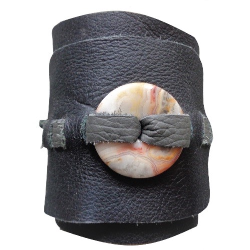 Stoere wikkelarmband van gerecycled zwart leer, versierd met mooie kwaliteit geslepen donut van Agaat Crazy Lace. De band is ca. 8 cm breed, geschikt voor vrijwel elke polsomvang en voorzien van gesp. De armband dient strak om de pols te worden gewikkeld en vastgemaakt om mooi te blijven zitten.