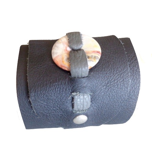 Stoere wikkelarmband van soepel, gerecycled zwart leer, versierd met mooie kwaliteit geslepen donut van Agaat Crazy Lace. Ook de gesp is gerecycled in dit sieraad voor stoere mannen en vrouwen. Als je van verfijnde, zachte materialen houdt dan is dit de passende armband voor jou!