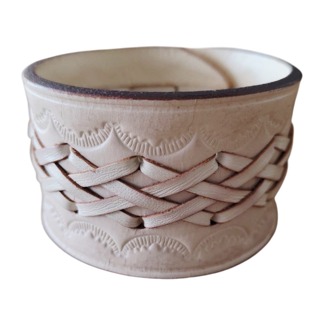 Stoere, (gebroken) wit leren cuff van hoogwaardig hergebruikt leer. Ook de sluiting is gerecycled in dit sieraad voor stoere mannen en vrouwen. Deze armband is met name geschikt voor mensen met bredere polsen. Wil je een opvallend armsieraad met subtiele details, dan is dit wellicht de armband voor jou.