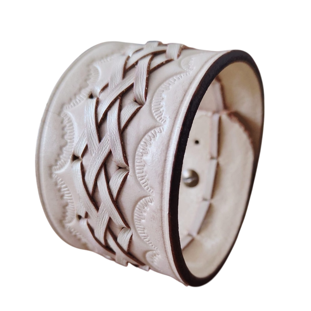 Stoere, (gebroken) wit leren cuff van bewerkt, hergebruikt leer. Deze armband is 4,5 cm breed en geschikt voor polsomvang van ca. 18 – 22 cm.